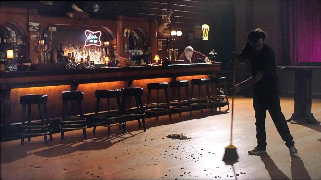 Sweeping the Roadhouse is as mundane and business as usual in Twin Peaks as pimping and trafficking. The broom becomes a metronome. The moral horror isn’t that these things happen—it’s that the town has done nothing to address the rot that contributed to Laura’s tragedy in the intervening 25 years.